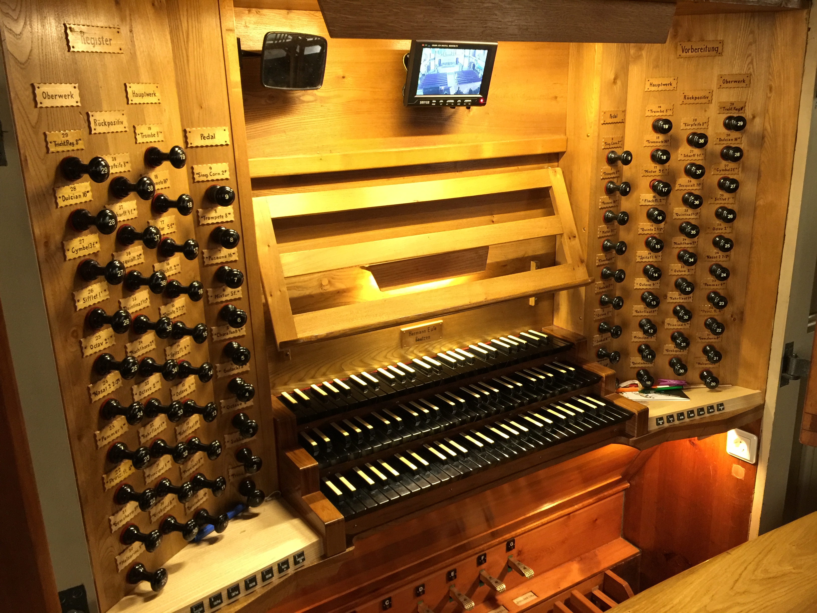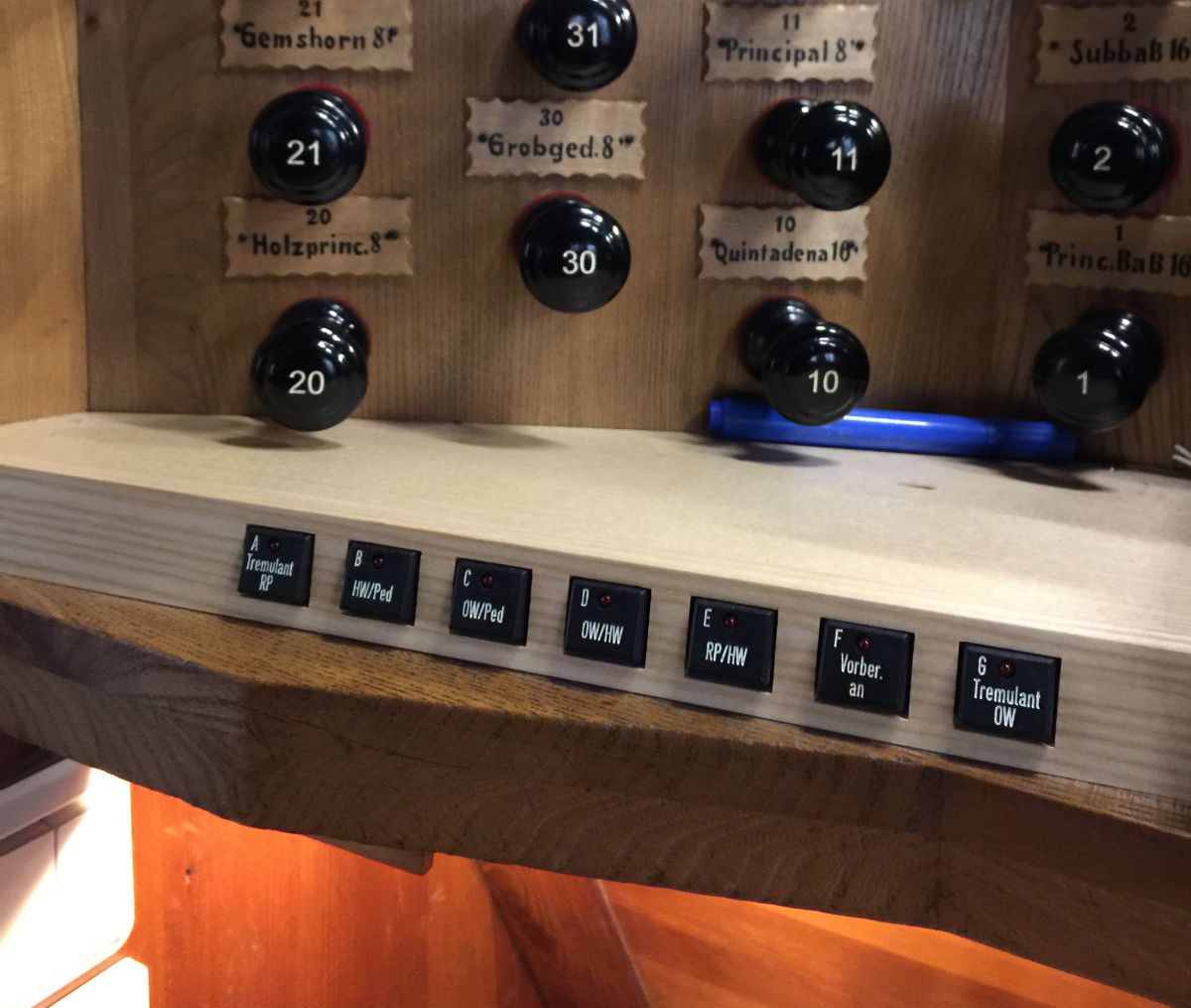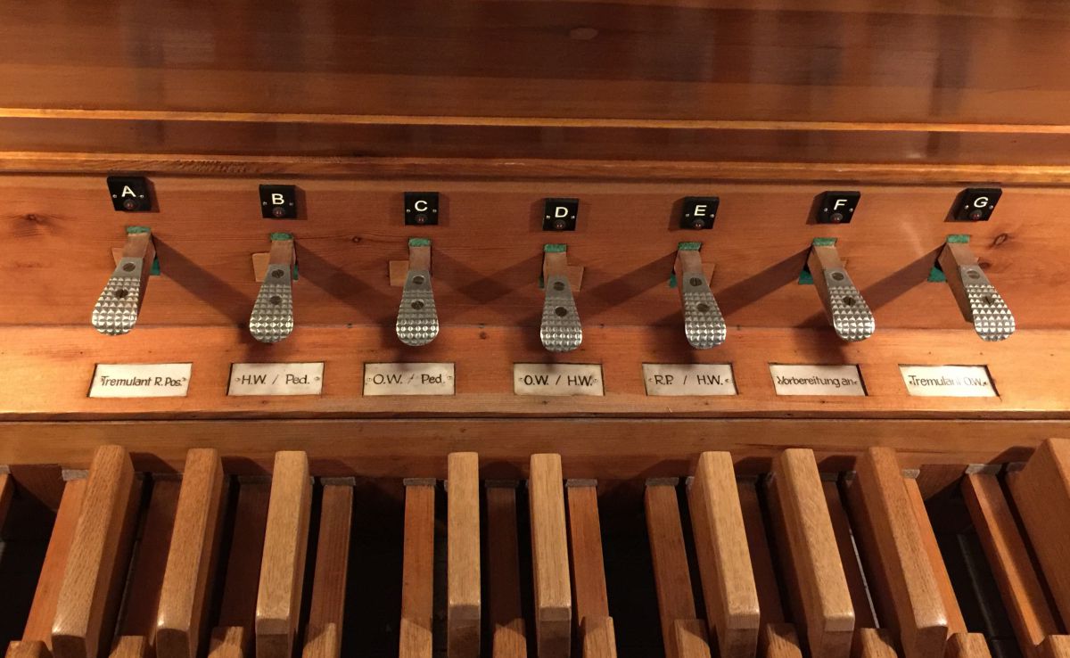 | Koppeln: HW/P, OW/P, OW/HW, Tremulant (jeweils zum OW und RP) Vorbereitung: über rechte Registerzüge des Spieltisches |