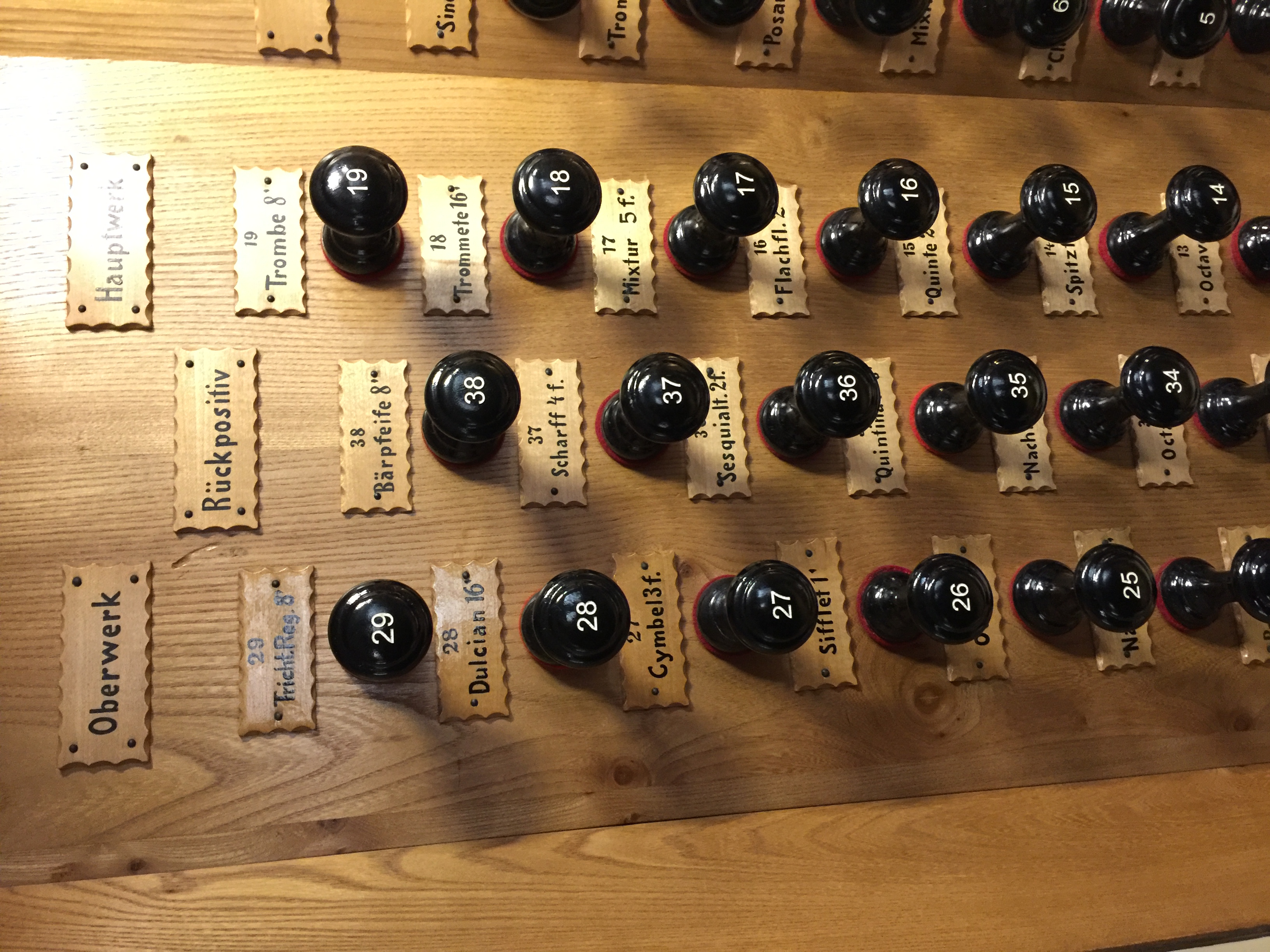 11. Holzprincipal 8' 12. Gemshorn 8' 13. Prinzipalflöte 4' 14. Pommer 4' 15. Nasat 2 2/3' 16. Octav 2' 17. Sifflet 1' 18. Cymbel 3-fach 19. Dulcian 16' 20. Trichter-Regal 8' |